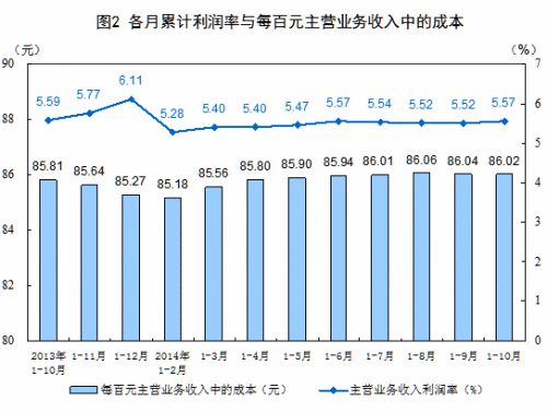 1-10月份,规模以上工业企业主营业务收入利润率为5.57%,每百元主营业务收入中的成本为86.02元,每百元资产实现的主营业务收入为123元,产成品存货周转天数为13.7天。