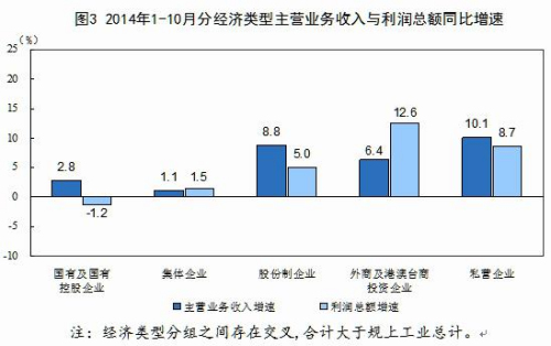 1-10月份,在规模以上工业企业中,国有及国有控股企业实现利润总额12100.3亿元,同比下降1.2%;集体企业实现利润总额415.2亿元,增长1.5%;股份制企业实现利润总额32626.5亿元,增长5%;外商及港澳台商投资企业实现利润总额12045.3亿元,增长12.6%;私营企业实现利润总额16491.7亿元,增长8.7%。