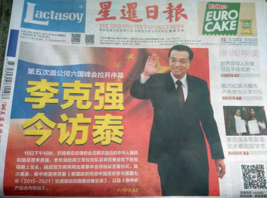 中新网曼谷12月20日电(记者 郭金超) 泰国媒体纷纷在头版头条位置对李克强总理的泰国之行予以报道,社会各界高度关注。泰国《星暹日报》在头版刊登总理大幅照片,称总理此行将推动和见证中泰两国之间签署多份友好合作协议,并回顾了2013年李克强总理访泰时的情景。