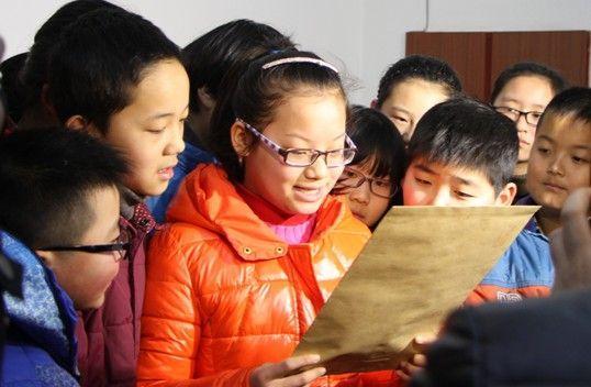 江欣桐(中)和同学们一同查看李克强总理的回信。 图片源自人民网