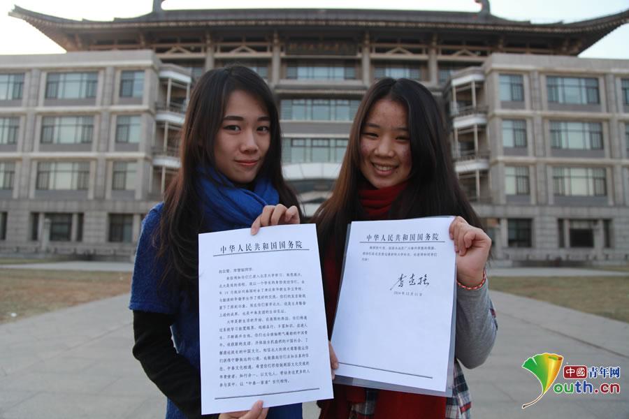 白云莹(左)、李慧敏(右)手持李克强总理的回信在北大图书馆前合影。 记者 李延兵摄