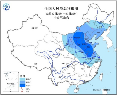 中新网12月30日电 据中央气象台预报,一股较强冷空气将从今天夜间开始影响中国中东部地区,带来大风降温并驱散雾霾;中央气象台解除大雾黄色预警;台风“蔷薇”将于明天夜间到后天进入南海。
