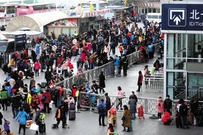 昨日,北京西站北广场,旅客正在进站,北广场比南广场进站更方便。明起,将迎来春节前铁路客流高峰。新京报记者 浦峰 摄