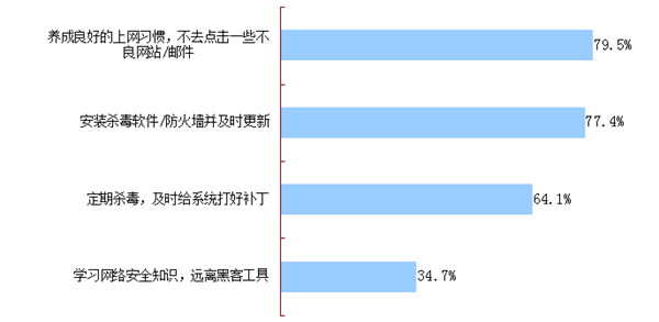 因此,在使用网络的同时,网民的防范网络风险/危机意识也在不断提高,有84.6%的网民认为个人防范网络风险/危机意识高,只有15.4%的网民觉得个人防范网络风险/危机意识低。对于最常采用的防范网络风险/危机措施,79.5%的网民表示会“养成良好的上网习惯,不去点击一些不良网站/邮件”,77.4%的网民表示会“安装杀毒软件/防火墙并及时更新”,两者的入选比例均接近8成。另外有64.1%的网民表示会“定期杀毒、及时给系统打好补丁”,但只有34.7%的网民表示会“学习网络安全知识,远离黑客工具”。
