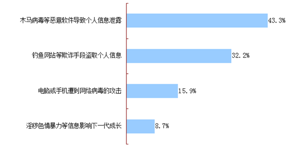 调查显示,95.6%的网民表示网络对个人生活产生了大的影响,只有4.4%的网民表示网络对个人生活的影响不大。 43.3%的网民表示最担心的网络不安全因素是“木马病毒等恶意软件导致个人信息泄露”,32.2%的网民表示最担心“钓鱼网站等欺诈手段盗取个人信息”,两者比例均超过了3成。
