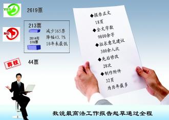 3月15日上午,十二届全国人大三次会议表决关于最高人民法院工作报告的决议草案,经表决,最高人民法院工作报告赞成2619票,反对213票,弃权44票。反对票数较2014年的378票减少165票,创10年来最低。
