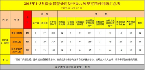 截至2015年3月底,全省查处违反中央八项规定精神问题如下: