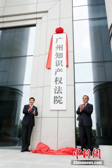 资料图:2014年12月16日,广州知识产权法院举行揭牌仪式,中共中央政治局委员、广东省委书记胡春华,最高人民法院常务副院长沈德咏共同为广州知识产权法院揭牌。中新社发 徐志毅 摄