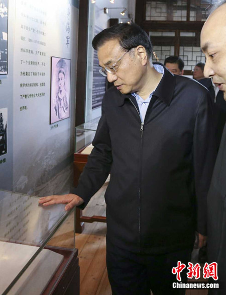 中新网福州4月24日电 (记者 郭金超) 李克强24日来到福州三坊七巷参观严复故居。总理说,严复学贯中西,是第一批“放眼看世界”的中国人。他向国人翻译介绍西学,启蒙了几代中国人,同时又葆有一颗纯正的“中国心”。每个中国人都应该记住严复。