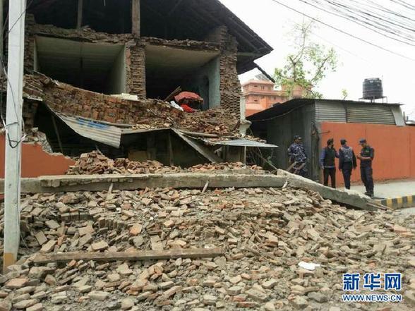 图为尼泊尔加德满都市中心在地震中倒塌的房屋。 新华社记者 周盛平 摄