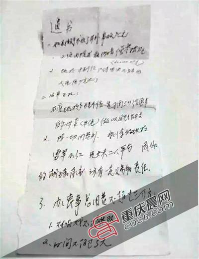 11日下午,在医院一间办公室内,记者看到了这封写在一张小小白纸上的遗书称,“不管赔偿多少到位,先抽3万给xx的母亲做生活开支。除一切费用外,剩余的现款给xx兄妹二人平分。办丧事总费用不超过3万元,不唱戏,不搞乐队,时间不超过5天。”