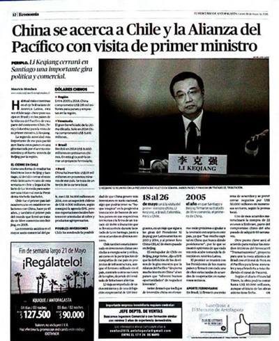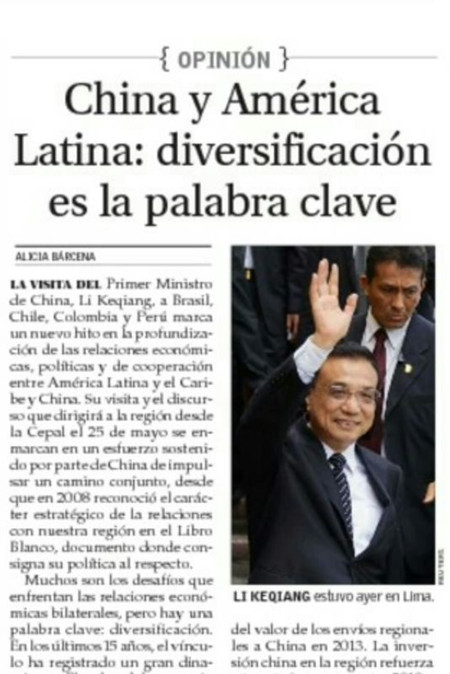 中新网圣地亚哥5月24日电(记者 郭金超) 李克强总理抵达智利当天,联合国拉美经委会执行秘书巴尔塞纳女士在智利第一大报《信使报》发表专栏文章《中国和拉美:多元化是关键词》,认为中拉关系充满活力,对李克强总理此访充满期待。此次访问智利期间,李克强将应邀在联合国拉美经委会发表演讲。