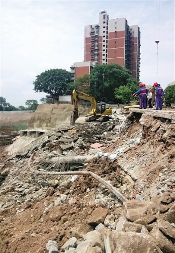 ▶事发现场位于南岸区朝天门桥头一工地。昨下午,受损管道正在抢修。