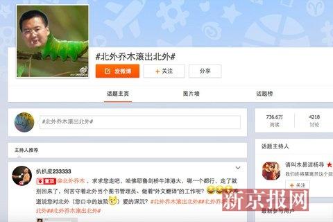 在新浪微博,新京报(官方微信:bjnews_xjb)记者以关键词“北外”和“乔木”进行搜索,出现一个推荐页面,名为“北外乔木滚出北外”。话题页的头像,是一条绿色毛毛虫,乔木头像被镶上两颗獠牙,并安在毛毛虫身上。