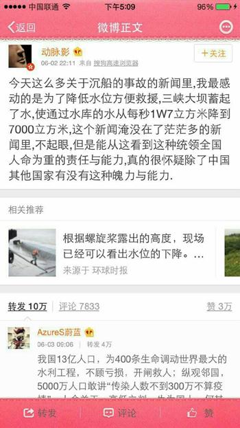 通过这条微博,每一个有良知有理性的中国网友都能感受到——翻沉救援中,这种统领全国、人命为重的责任与能力,我们的祖国有这种魄力与能力。