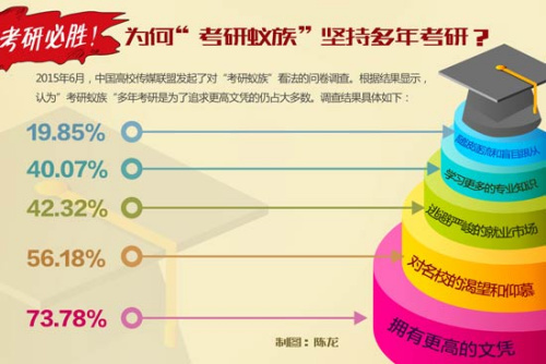 对此,中国高校传媒联盟在微信公众账号中发起了对“考研蚁族”看法的问卷调查。参与调研的几百名大学生认为“考研蚁族”坚持考研是因为追求名校情结的达56.18%,有73.78%的受访者认为,考研蚁族是为了更高的文凭;高达86.79%的群体认为考研的意义在于可以获取高学历带来的职业竞争优势。有42.32%的群体认为“考研蚁”坚持考研的原因之一是逃避就业。