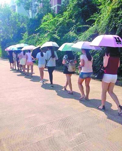 这个女生的行为,马上得到了其他女生的模仿,很快,十多个女生就自觉地排成了一队走路,走在后面的人借助前面人的影子躲避太阳。有路过的男生看的这一幕很是惊讶,并打趣地说:“你们想过第一个女生的感受吗?”