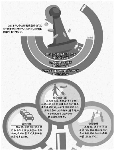 2014年,中央行政事业单位“三公”经费支出合计58.8亿元,比预算数减少12.71亿元,减少额度占预算数的17.8%。这意味着,去年中央三公预算中近两成没花。楼继伟介绍,主要是各部门贯彻落实中央八项规定和厉行节约有关要求,压缩、取消部分出国(境)团组,加强公务用车管理,规范公务接待活动,减少了相关支出。