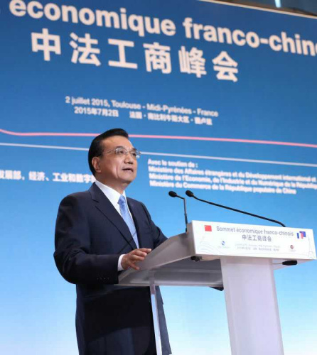 中新网图卢兹7月2日电 (记者 欧阳开宇)李克强总理2日在中法工商峰会演讲时表示,中法建交50年来,两国关系积累了宝贵经验,未来50年的中法关系将更灿烂辉煌。戴高乐将军曾说,如果不伟大,就不是法兰西。同样,如果不伟大,就不是中华民族。中法两个伟大国家加强合作,既利于双方,也利于世界。