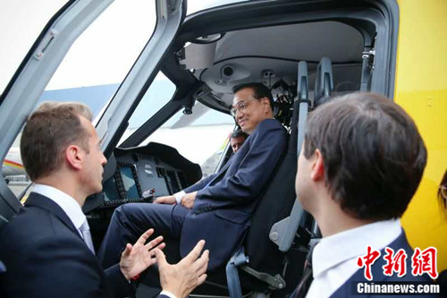 中新网图卢兹7月3日电(记者 欧阳开宇) 李克强总理2日在法国总理瓦尔斯陪同下考察航空工业。李克强说,航天航空合作已成为中法、中欧务实合作的典范。双方合作不是简单买卖关系,而是优势互补的战略对接。随着“中国制造2025”实施,中国中高端制造能力会日益提升,中法合作会飞得更快更高更远。