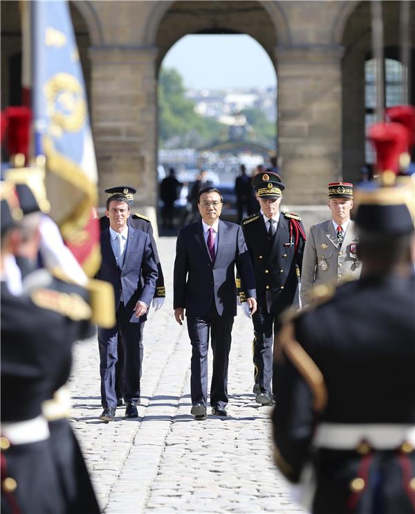 6月30日,国务院总理李克强出席法国总理瓦尔斯在法国荣军院举行的隆重欢迎仪式。新华社记者庞兴雷摄