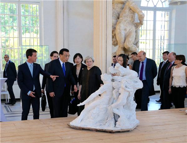 6月30日晚,国务院总理李克强在法国总理瓦尔斯陪同下参观罗丹博物馆。新华社记者马占成摄