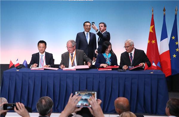 两国总理直接从机场同车赶往中法工商峰会的现场,发表了热情洋溢而又机智幽默的演讲。李克强说,如果把中法合作比作一架大飞机,两国企业就是双引擎。