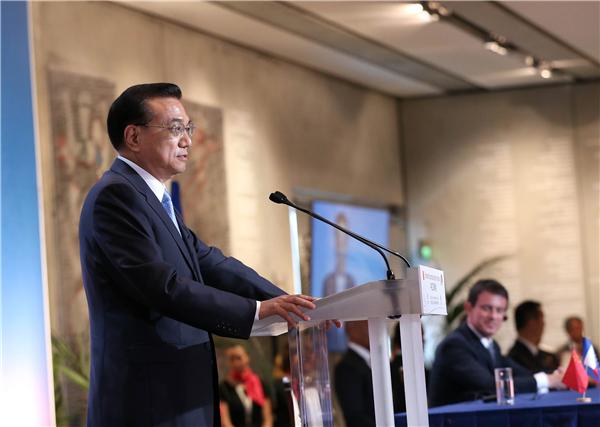 7月2日,国务院总理李克强在法国总理瓦尔斯陪同下出席中法工商峰会并致辞。新华社记者庞兴雷摄