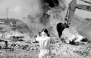 8月23日,武警交通部队战士用大型机械清理天津港爆炸事故现场,现场仍可发现烟雾与火点。新华社发