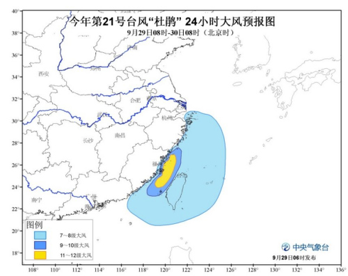 29日08时至30日08时,新疆东部、华北北部、四川盆地北部、黄淮中部、江南中东部、广东东北部、台湾等地有中到大雨,其中,浙江东部和南部、福建、广东东北部等地有暴雨或大暴雨,福建沿海局部地区有特大暴雨(250~260毫米);上述地区伴有短时强降水(最大小时雨强80~100毫米)。南海东北部、台湾以东洋面、东海大部以及台湾沿海、福建沿海、浙江沿海有7-8级大风,其中台湾海峡、东海西南部、福建中北部沿海、浙江东南部沿海的风力有9-10级,“杜鹃”中心经过的附近海域或地区的风力有11-12级,阵风可达13级。