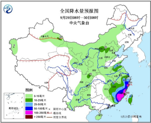 预计9月29日08时至30日08时,浙江东部和南部、福建、广东东北部、江西东南部和北部、台湾西北部等地有大雨或暴雨,其中,浙江东部沿海、福建东部和南部有大暴雨(100~180毫米),福建沿海局部地区有特大暴雨(250~260毫米);上述地区伴有短时强降水(最大小时雨强80~100毫米)。另外,黄淮中部等地有分散性大雨。中央气象台9月29日06时继续发布暴雨黄色预警。