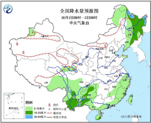 10月1日08时至10月2日08时,内蒙古东北部、东北地区大部、江南中东部、华南南部、西南地区大部等地有小到中雨,其中,黑龙江北部、云南北部和东部、贵州西南部的部分地区有大雨。内蒙古中东部、华北北部、东北地区西部、江淮等地有4~6级风。渤海、黄海大部将有6~8级风,东海北部将有7~8级风。