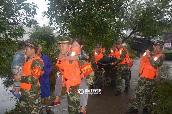 9月28日,平阳昆阳镇平塔村,武警温州支队平阳县中队党员突击队与村干部一起转移危房里的村民,迎战杜鹃台风。浙江日报记者 胡元勇 通讯员 郑祥隆 摄