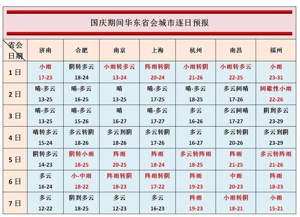 随着“杜鹃”今天登陆福建,今天到明天夜间,申城风雨明显,过程累积雨量预计为40~80毫米,局部可达100毫米以上。但今夜,“杜鹃”将逐步深入江西腹地,并减弱为低气压,因此,即使30日夜间至1日前期,南下的冷空气和“杜鹃”残留云系的“纠缠”让申城的雨期向后延至国庆节当天,10月1日后期起本市天气就逐步转好。10月2日到4日,本市以晴或多云天气为主,气温保持在17~24℃之间,5日前后才有一次降水过程。而对于要去外地旅游的市民,随着“杜鹃”不断北上,浙江方向的出行会比去安徽和江苏更早“解禁”。