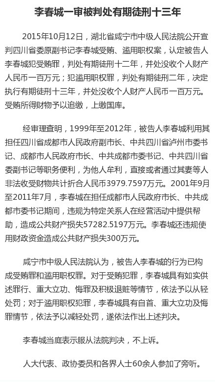 据湖北省咸宁市中级人民法院官方微博消息,咸宁中院12日公开宣判四川省委原副书记李春城受贿、滥用职权案,对李春城两罪并罚,决定执行有期徒刑13年,并处没收个人财产100万元。受贿所得财物予以追缴,上缴国库。