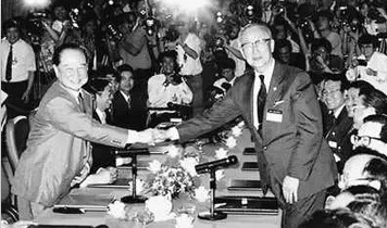 1993年4月27日上午10时,汪道涵先生(左)和辜振甫先生越过会议桌,紧紧握手。(资料图)