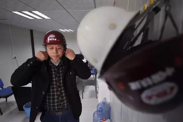 2015年12月10日,在施工工地的办公室,范勇正在摘下安全帽。