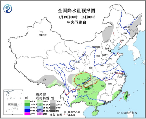 13日08时至14日08时,西藏东部、川西高原中部、内蒙古中部、东北地区东北部、湖北西南部、湖南西北部、贵州北部、重庆东南部等地有小雪或雨夹雪;西南地区东部、云南东部、江南西部和东南部、华南西部、台湾等地有小到中雨。内蒙古中东部、山东半岛等地有4~5级风。台湾海峡、巴士海峡有6~7级、阵风8级的东北风。