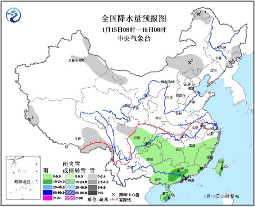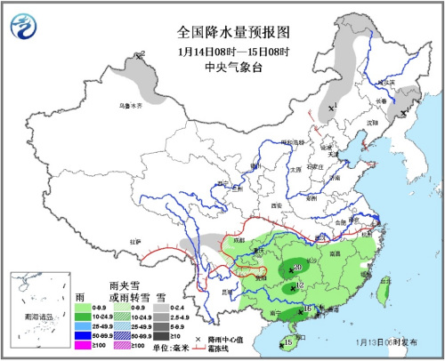 14日08时至15日08时,新疆北部、内蒙古中东部、吉林东部、西藏东部、川西高原中部、贵州西北部等地有小雪或雨夹雪;西南地区东部、云南东部、江南大部、华南、台湾等地有小到中雨。内蒙古中部、华北北部、辽东半岛、山东半岛等地有4~5级偏北风。