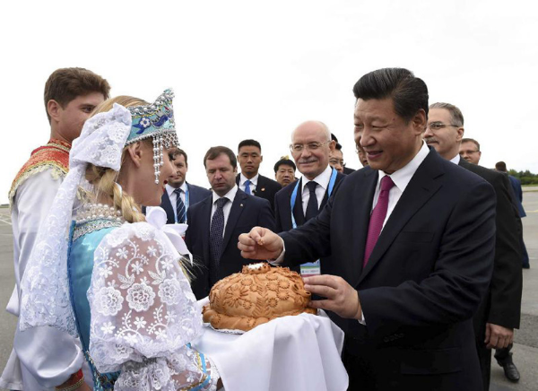 图为:2015年7月8日,国家主席习近平乘坐专机抵达乌法,应俄罗斯联邦总统普京邀请,出席金砖国家领导人第七次会晤和上海合作组织成员国元首理事会第十五次会议。这是在乌法国际机场,身穿俄罗斯民族服饰的青年按当地迎接贵宾的传统,向习近平敬献面包和盐。习近平掰下一小块面包,蘸盐品尝。