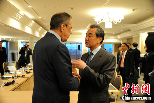 中新社慕尼黑2月11日电 (记者 彭大伟)中国外交部长王毅11日在慕尼黑出席叙利亚国际支持小组第四次外长会前会见俄罗斯外长拉夫罗夫。