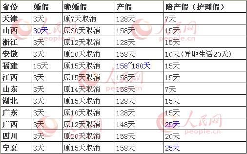 人民网整理发现,目前出台新计生条例的12个省份均取消了晚婚假,同时对产假和男性陪产、护理假做出一定调整。其中,山西、安徽、江西、山东、四川、宁夏6省份,产假为158天,福建产假最短158天最长可休180天;而天津、浙江、湖北、广东4省份,产假为128天,相差近两个月;陪产、护理假方面,广西和宁夏假期最长,为25天,天津、山东则仅有7天。(具体见表)