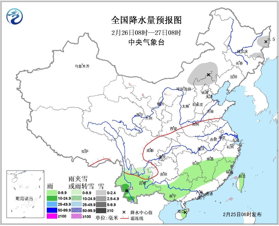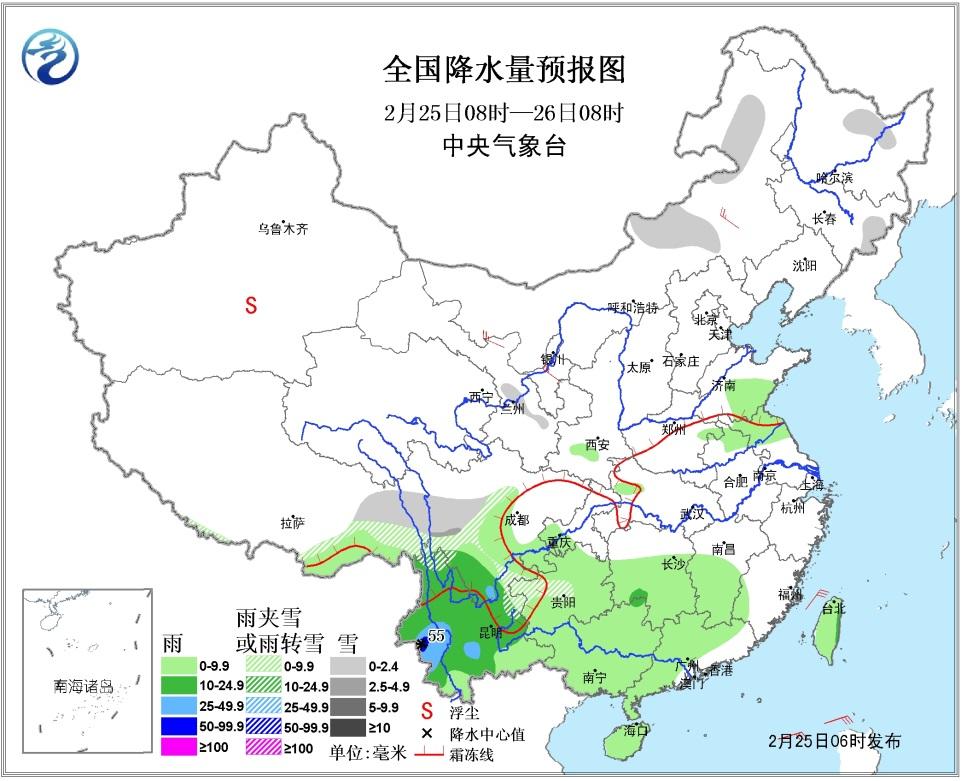 25日08时至26日08时,内蒙古东部、黑龙江中部、吉林东部、西藏东北部、川西高原中部、云南东北部和西北部、贵州西部等地有小到中雪或雨夹雪;西藏东南部、云南大部、贵州大部、四川盆地南部、黄淮东部、江南西南部、华南中西部、台湾等地有小到中雨,其中,云南中部和西部等地的部分地区有大雨,局地暴雨(50~55毫米)。南疆盆地、内蒙古西部、宁夏北部、甘肃西部等地的部分地区有扬沙或浮尘。台湾海峡、巴士海峡、南海东北部和中部有7~8级风、阵风9级。