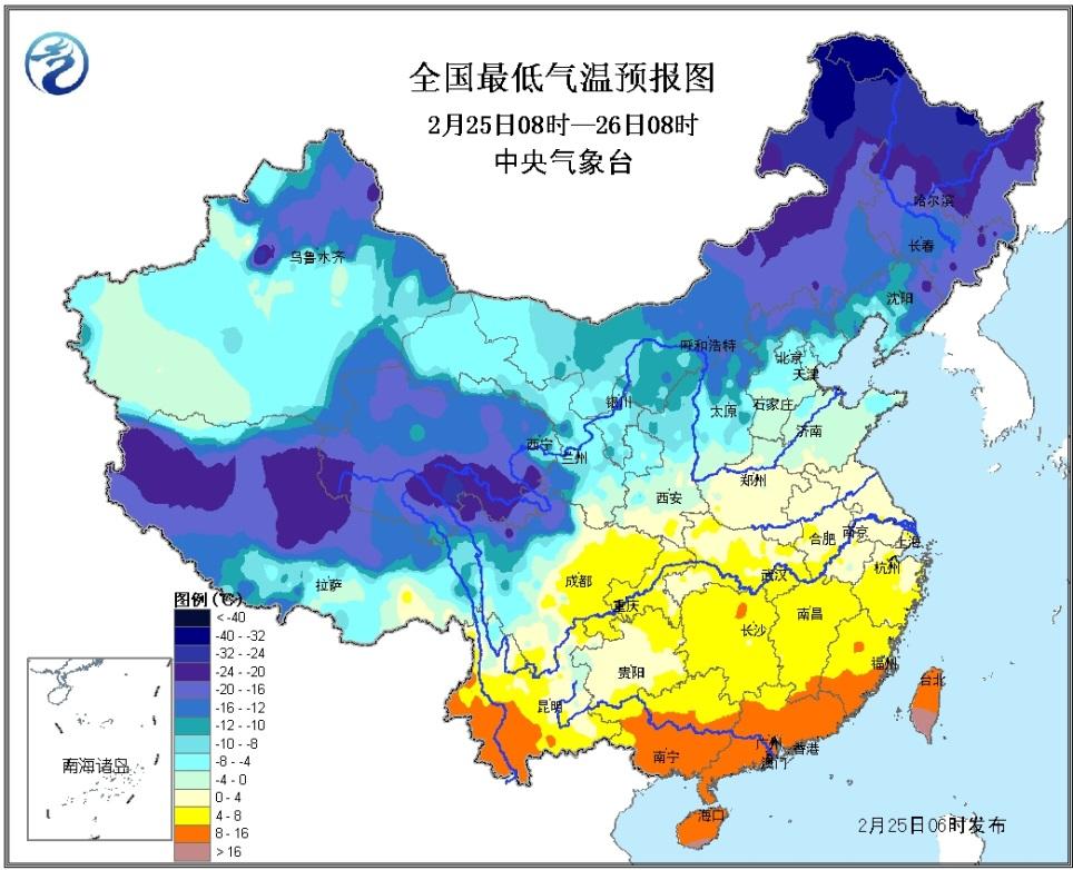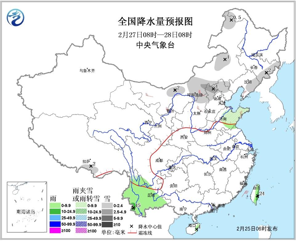 未来三天,南方降水逐渐减弱,但25日云南等地有中到大雨,局地暴雨,西藏东北部、川西高原、贵州西北部、云南东北部等地的部分地区有小到中雪或雨夹雪;25~27日内蒙古中东部、东北、华北北部等地的部分地区有分散性的小到中雪。