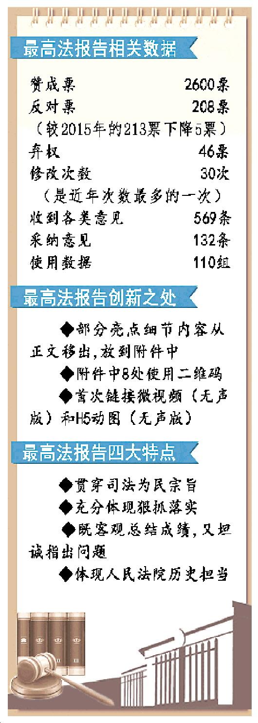 报告信息量很大,全篇用44个段落和110组数据介绍了人民法院不同方面的工作。为落实“短、实、新”要求,起草组把部分亮点工作的细节内容从正文移出,放到附件中。附件在去年报告的基础上有所创新,适应“互联网+”时代要求,8处使用二维码,首次链接微视频(无声版)和H5动图(无声版),使报告“动”起来,变得可视化,努力增强报告的感染力、吸引力和亲和力,既方便代表委员审议讨论工作报告,又体现人性化,以“无声版”的视频和动图全景呈现人民法院工作。