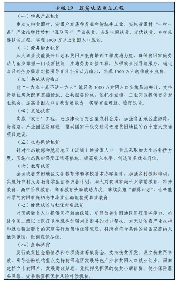 根据致贫原因和脱贫需求,对贫困人口实行分类精准扶持。通过发展特色产业、转移就业、易地扶贫搬迁、生态保护扶贫、教育培训、开展医疗保险和医疗救助等措施,实现约5000万建档立卡贫困人口脱贫;通过实行社保政策兜底,实现其余完全或部分丧失劳动能力的贫困人口脱贫。探索资产收益扶持制度,通过土地托管、扶持资金折股量化、农村土地经营权入股等方式,让贫困人口分享更多资产收益。