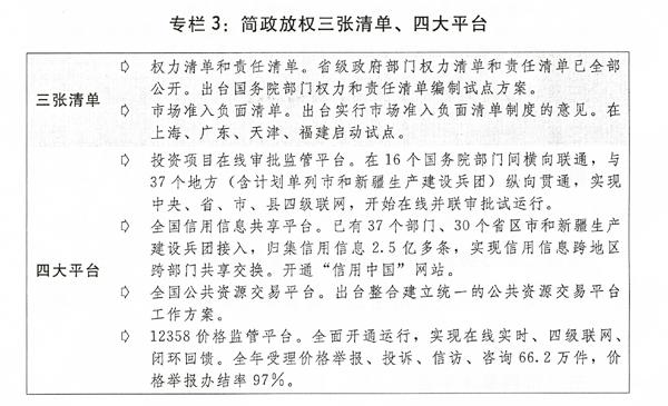 一是推动简政放权放管结合优化服务向纵深发展。继续取消和下放一批行政审批事项,增强放权的协同性。全面公布地方政府权力和责任清单,开展国务院部门权责清单编制试点,在部分地区试行市场准入负面清单制度。推进综合执法和大数据监管,运用市场、信用、法治等手段协同监管。加快推进社会信用体系建设,拓展全国信用信息共享平台覆盖范围和服务功能,强化守信联合激励和失信联合惩戒机制。全面实施统一社会信用代码制度,推进“三证合一”、“一照一码”,开展“证照分离”试点。加快实施公共资源交易市场化改革,整合建立统一的公共资源交易平台。改进政府服务方式,推广“互联网+政务服务”,实现部门间数据共享,加快推进行政审批标准化建设。推动不动产统一登记制度在基层落地实施。