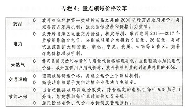 四是价格改革力度加大。印发实施推进价格机制改革的若干意见。放开、下放近40项商品和服务价格。修订政府定价目录,中央、地方具体定价项目分别减少80%和55%。降低燃煤发电上网电价和工商业用电价格,大幅降低非居民用天然气门站价格。健全节能环保价格政策。继续清理规范进出口环节收费。