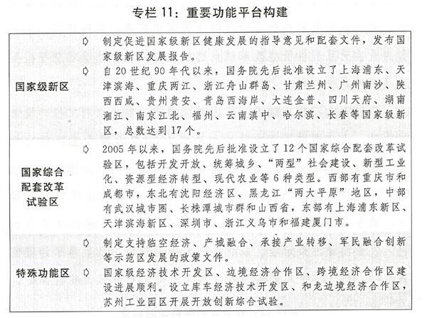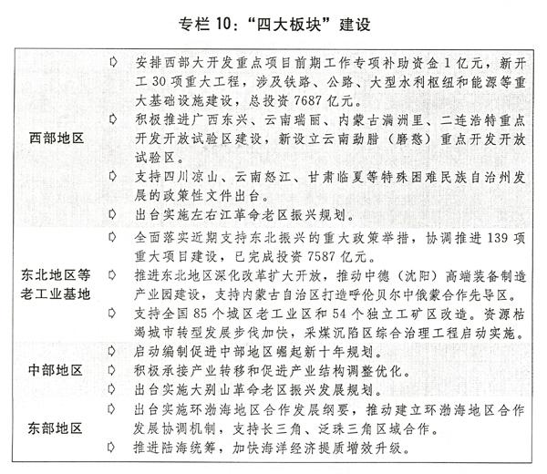 二是深入推进“四大板块”协调发展。支持宁夏、贵州等西部地区发展各具特色的内陆开放型经济,推进创新平台和创新体系建设。加大对中西部地区基础设施等薄弱环节的投资力度,加强生态保护和修复,培育壮大特色优势产业。实施新一轮东北地区等老工业基地振兴战略,培育形成以哈大经济带为主轴的东北地区城市群。出台促进中部地区崛起新十年规划,推动长江中游城市群、中原经济区、皖江城市带等重点经济区发展,推进淮河、汉江生态经济带建设,支持山西建设清洁能源基地。继续支持东部地区在改革创新、转型升级、提质增效上率先发展,发挥示范作用。深入推进海南国际旅游岛建设。大力发展海洋经济,推进海洋经济发展示范区建设。推进国家级新区、承接产业转移示范区等重要功能平台建设,鼓励各地先行先试,在体制机制改革、区域协同发展中当好排头兵。有序推广国家综合配套改革试验区成熟的改革经验。推进重点地区一体化发展,支持有条件的地区开展同城化探索。