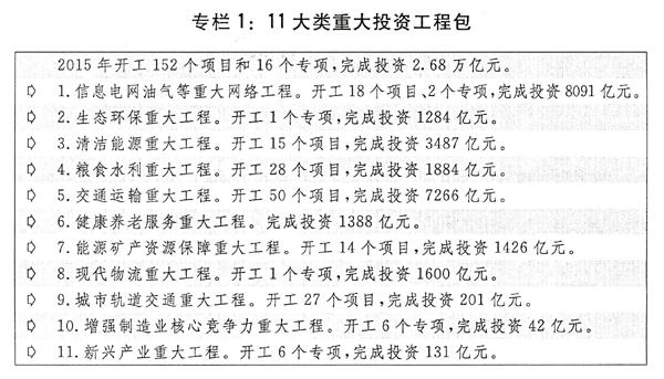二是着力补短板、调结构、提高投资的有效性。牢牢抓住关键领域和薄弱环节,创新政府性资金使用方式,充分发挥中央预算内投资、专项建设基金“四两拨千斤”的引导带动作用,着力补短板,扩大有效投资。2016年全社会固定资产投资预期增长10.5%左右。第一,进一步优化用好预算内投资。中央预算内投资拟安排5000亿元,重点支持保障性安居工程、粮食水利、中西部铁路、科技创新、节能环保和生态建设、教育卫生文化等社会事业、老少边贫地区建设等。第二,充分发挥专项建设基金带动作用。按季度安排市场化方式筹措的专项建设基金,保持适度规模。积极推动社会资本跟进,发挥投贷结合效应。加大企业债券发行力度,鼓励发行城市地下综合管廊、停车场、战略性新兴产业、养老产业、配电网建设改造、双创孵化、绿色债券等企业债券创新品种。第三,组织编制三年滚动投资计划。切实加强政府投资项目储备,做到储备报批一批、开工建设一批、投产达标一批,形成接续不断、滚动实施的储备机制和良性循环。第四,着力激活社会投资。统筹安排中央预算内投资和专项建设基金,优先支持符合投向的政府和社会资本合作(PPP)项目建设。进一步放宽市场准入,拓宽社会资本投资渠道。加快出台政府投资条例、基础设施和公用事业特许经营条例、企业投资项目核准和备案管理条例。第五,加强关键领域薄弱环节重大工程建设。着力推进脱贫攻坚、棚户区改造、农村电网和城镇配电网改造、重大水利工程、铁路、公路、城市轨道交通、重点流域水污染治理和企业技术改造等“十三五”重点专项和重大项目建设。新开工20项重大水利工程。实施交通“一二三百”、西北风光电基地和军民融合重大战略工程。加强投资管理,加大项目监督稽察力度。